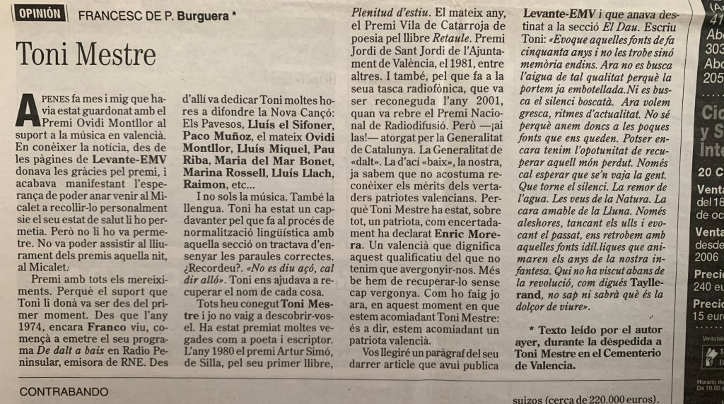 Fira del Llibre València.Recordant Toni MestrePerfil. Violeta Tena. El Temps.Paco Muñoz i Lluís MiquelAdeu a Toni Mestre. “Levante” 30.07.2006ÒBIT Toni Mestre. “Levante”“Toni Mestre” “El Punt”