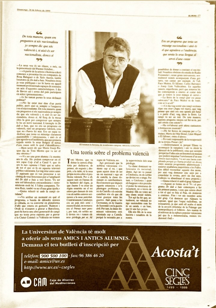 Cristòfor Martí AdellToni Mestre. Entrevista.”El Punt” Premi Ovidi Montllor.Jesus Huguet. Cal dir.Francesc de P. Burguera. Toni Mestre.Diari “El Punt” 28/02/1999